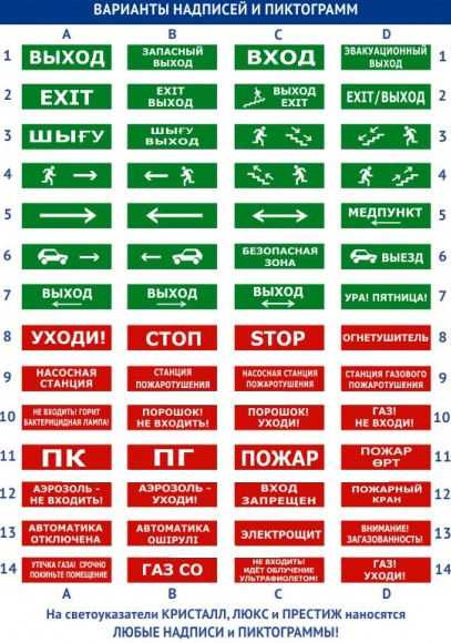 Стандартный набор надписей и пиктограмм (см. рис.) соответствует нормам аварийного освещения (размер и форма символов, цвет фона). Доступно изготовление указателей с любыми изображениями и надписями на заказ.